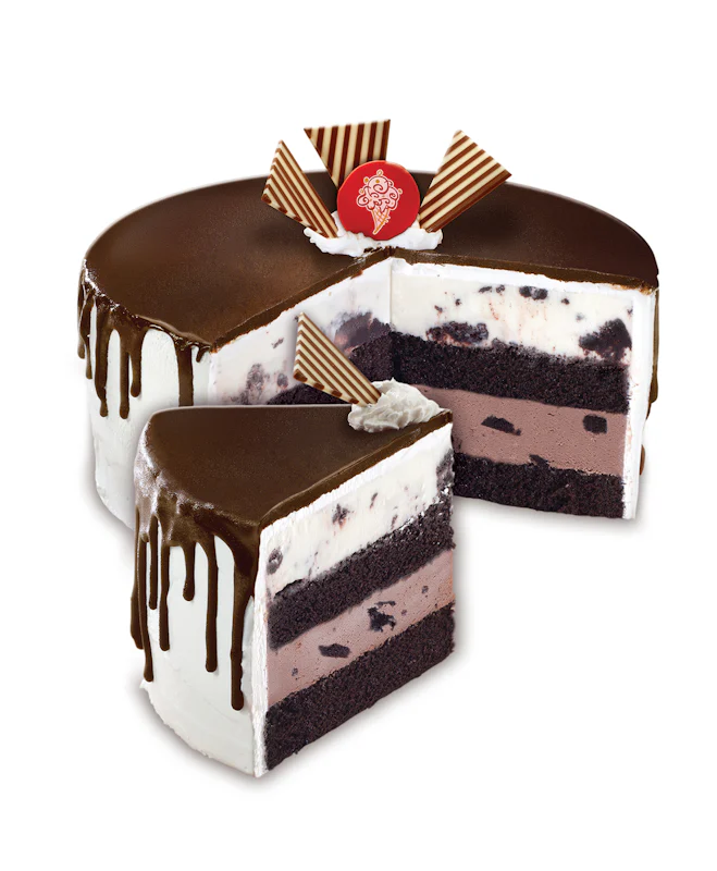 Layers of moist Devil’s Food Cake, Sweet Cream Ice Cream with Brownies and Chocolate Ice Cream with OREO® Cookies wrapped in fluffy White Frosting and cascading Fudge Ganache **This item is ready for you to pick up which means we cannot make any changes or substitutions.