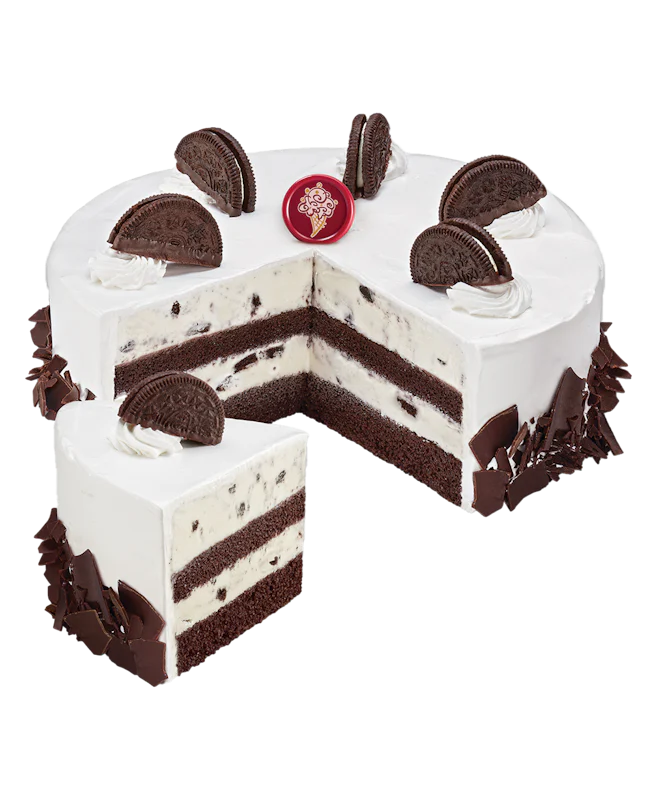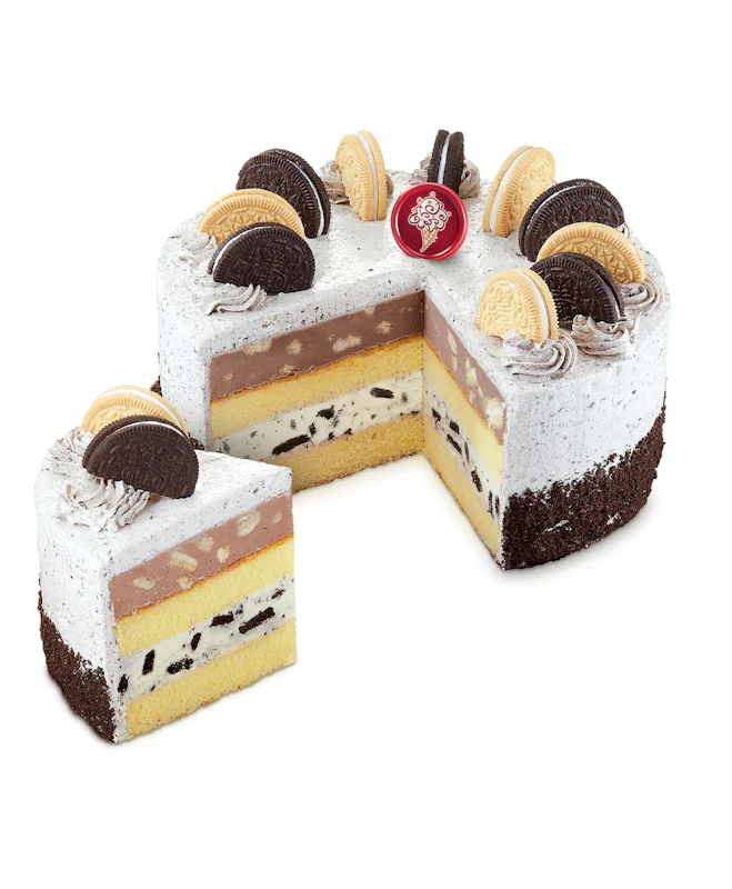Layers of moist Yellow Cake, Chocolate Ice Cream with GOLDEN OREO® Cookies and Cake Batter Ice Cream® with OREO® Cookies wrapped in fluffy OREO® Cookie Frosting **This item is ready for you to pick up which means we cannot make any changes or substitutions.