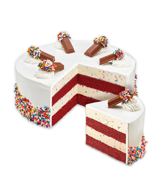 Layers of moist Red Velvet Cake and Cake Batter Ice Cream® with Rainbow Sprinkles wrapped in fluffy White Frosting **This item is ready for you to pick up which means we cannot make any changes or substitutions.